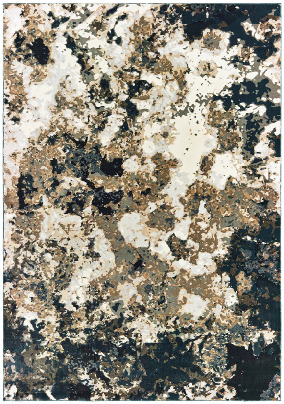 A furniture friendly color palette of fresh, light neutrals are contrasted with deep navy and black as well as subtle shades of warm blush and soft camel. Machine-woven of a polypropylene/polyester blend.